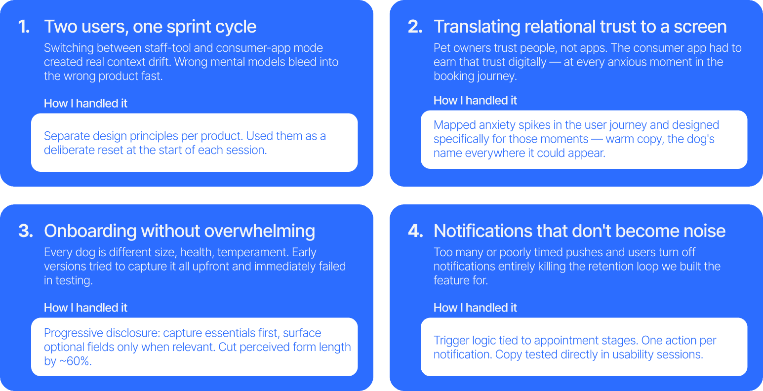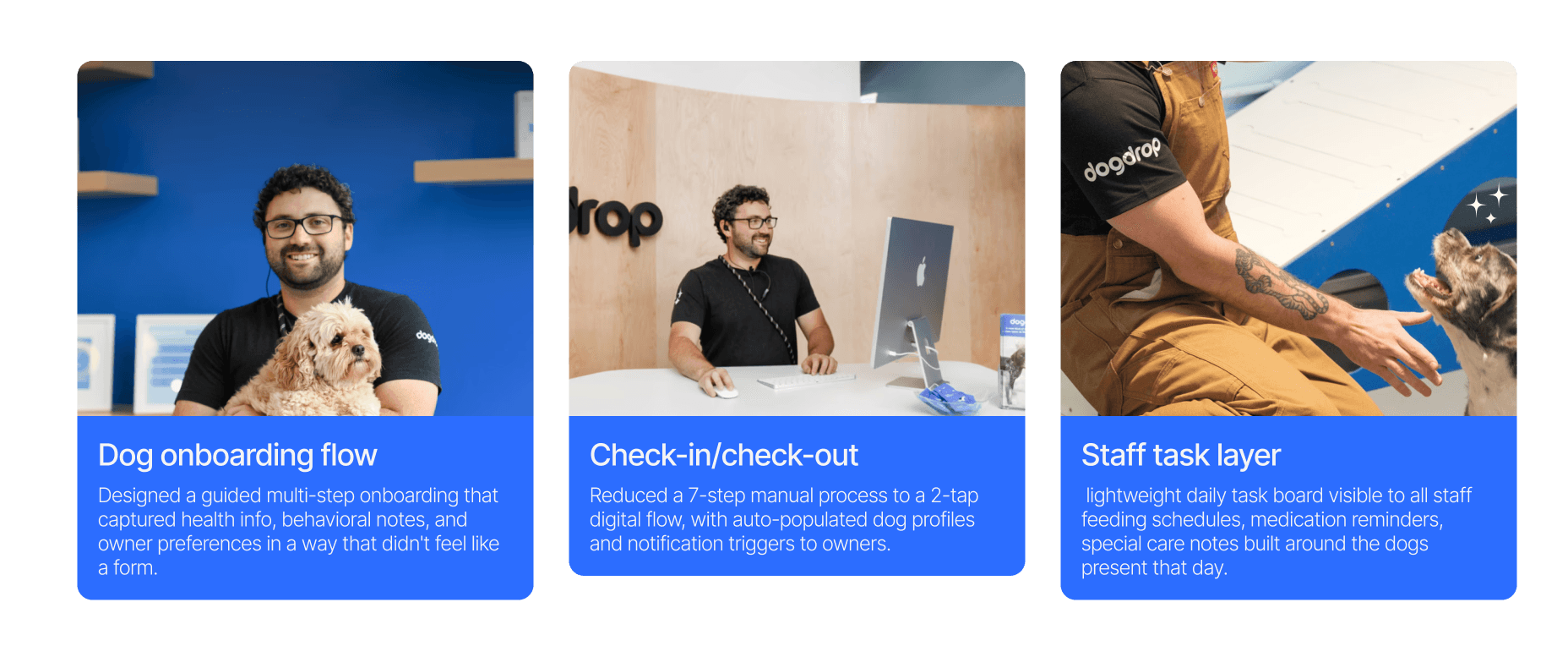I conducted research in parallel talking to franchisee operators and pet owners to understand the real friction on both ends. Methods included stakeholder interviews, competitive analysis, and contextual observation at a pilot DogDrop location.