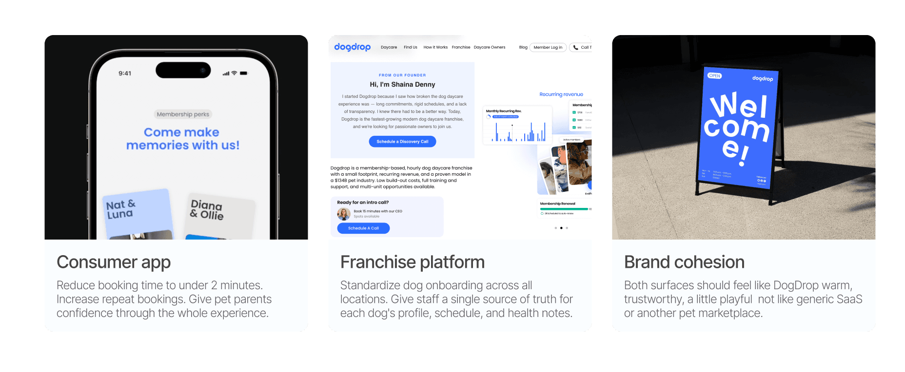 DogDrop is a dog daycare business that operates on a franchise model. As the brand scaled, they faced two distinct but connected challenges: franchisees needed operational software to run their locations efficiently, and pet owners needed a seamless consumer app to book, manage, and stay connected with their dog's daycare experience.