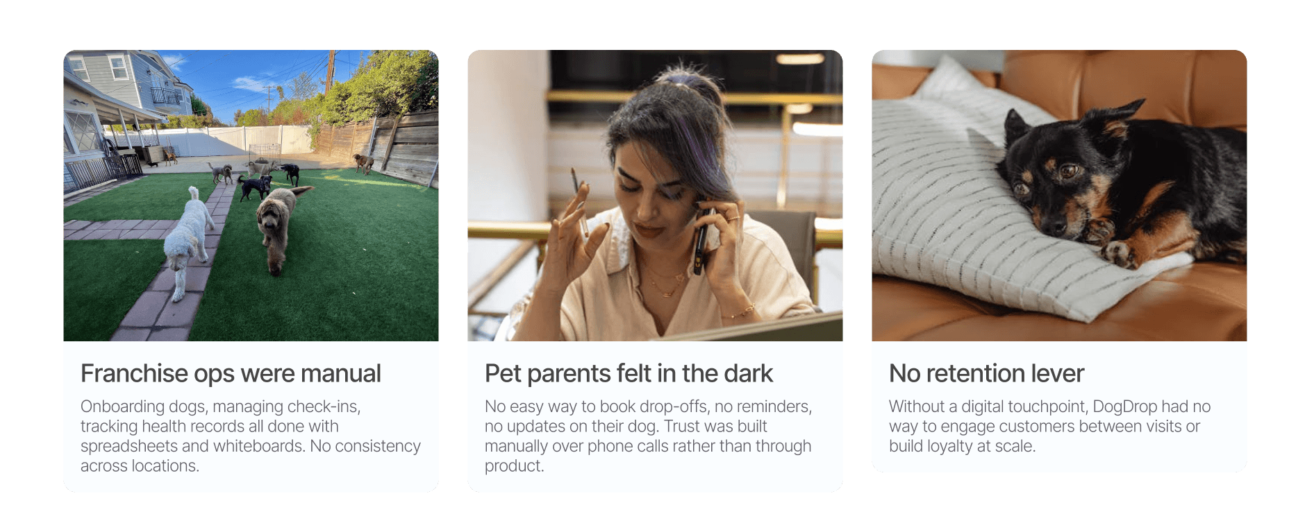 The pet care industry was growing fast but the tools available to both franchisees and pet owners were not keeping pace. DogDrop faced two parallel problems: