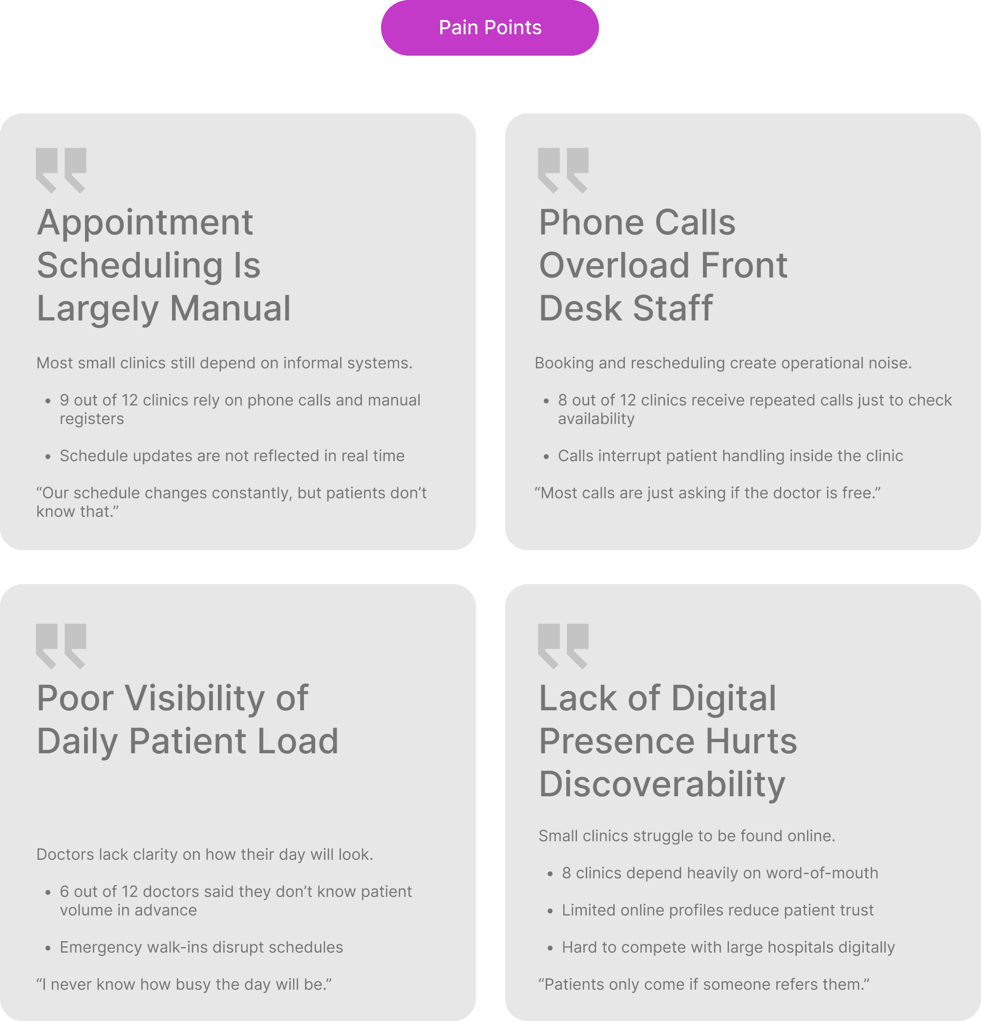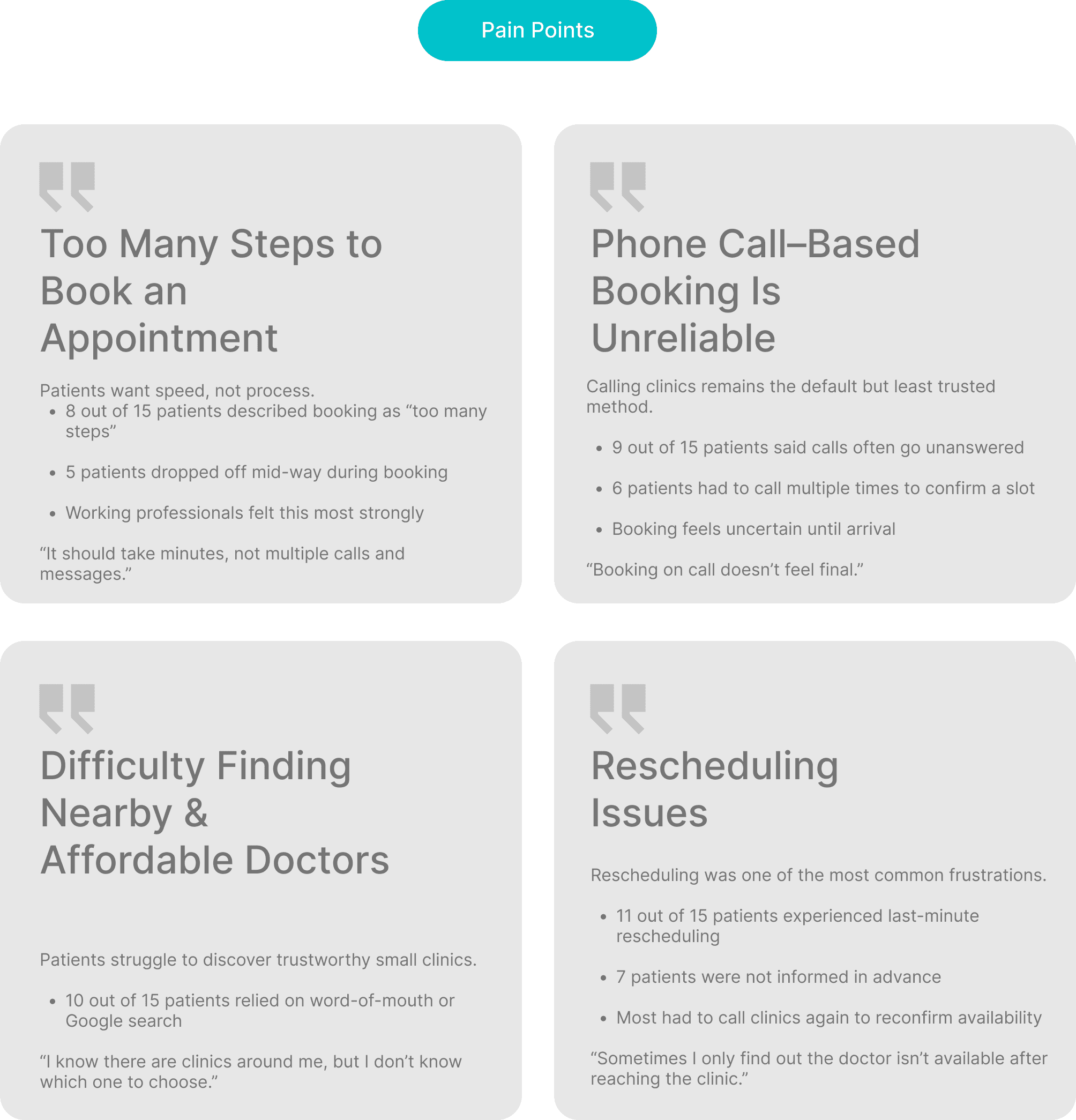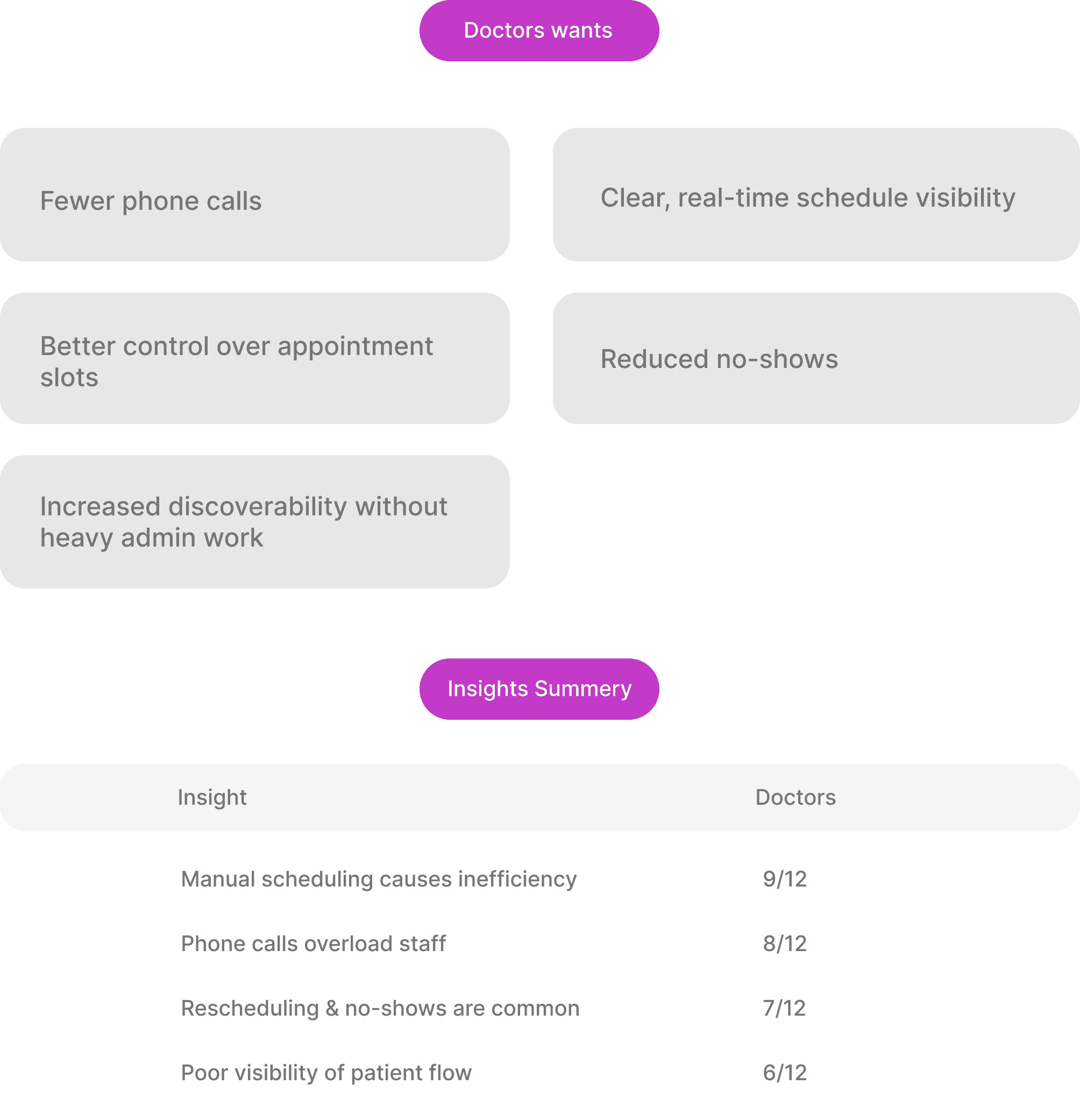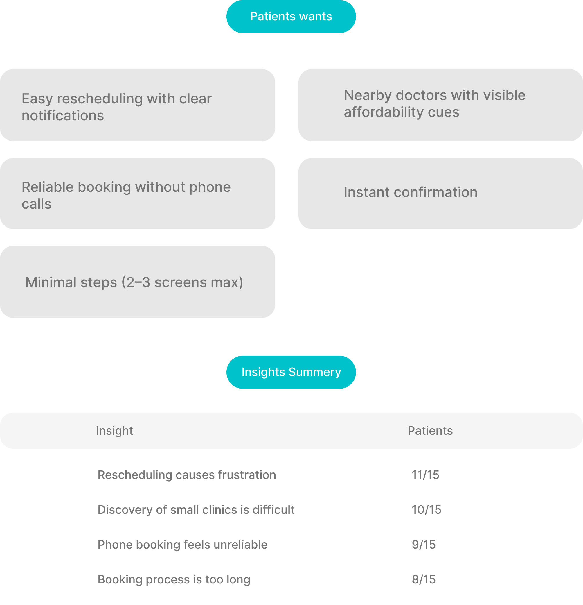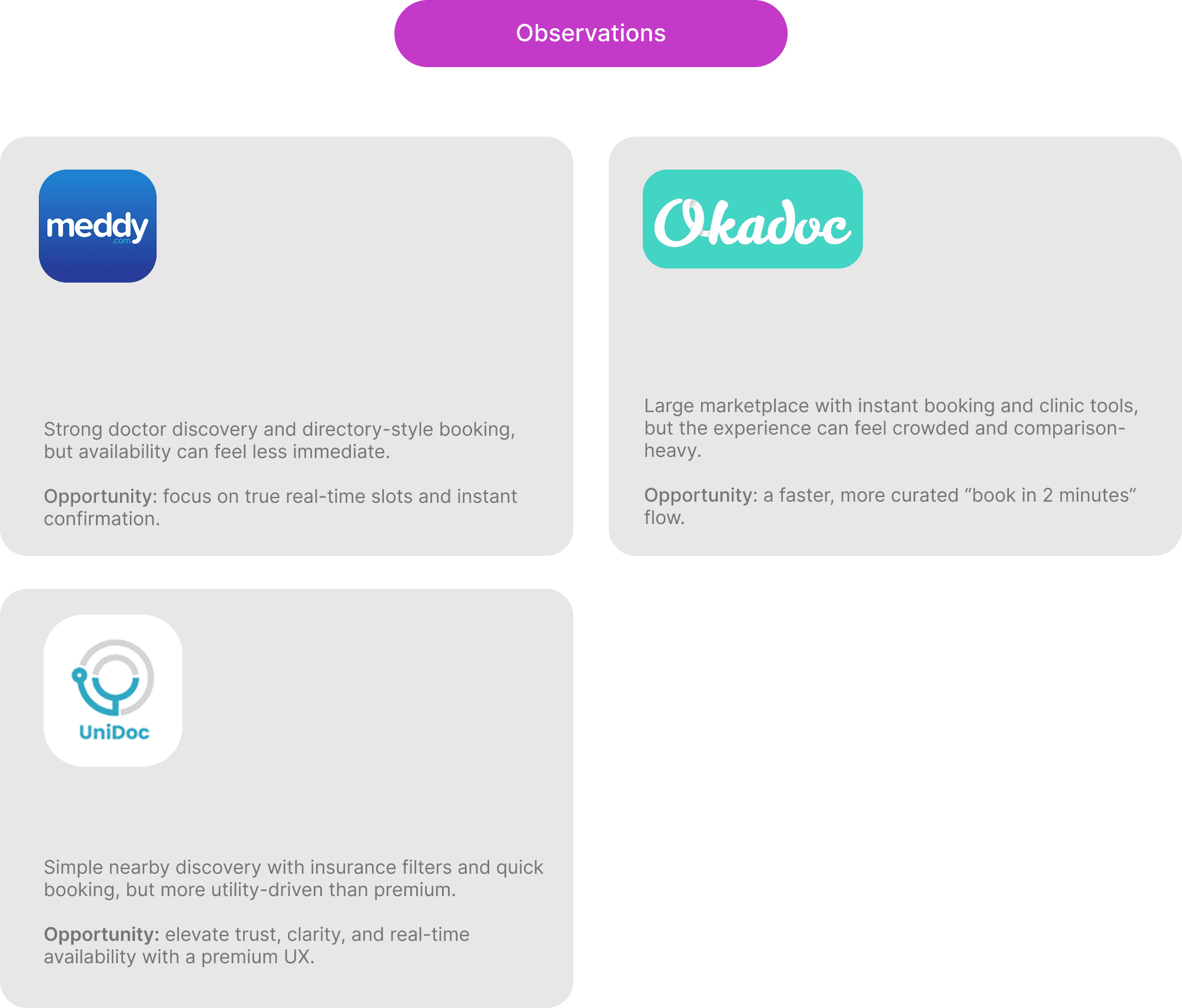Both patients and clinics needed speed, clarity, and real-time availability, patients to book faster with confidence, and clinics to manage schedules more efficiently. These insights reinforced the need for instant booking and transparent availability in House of Doctors.