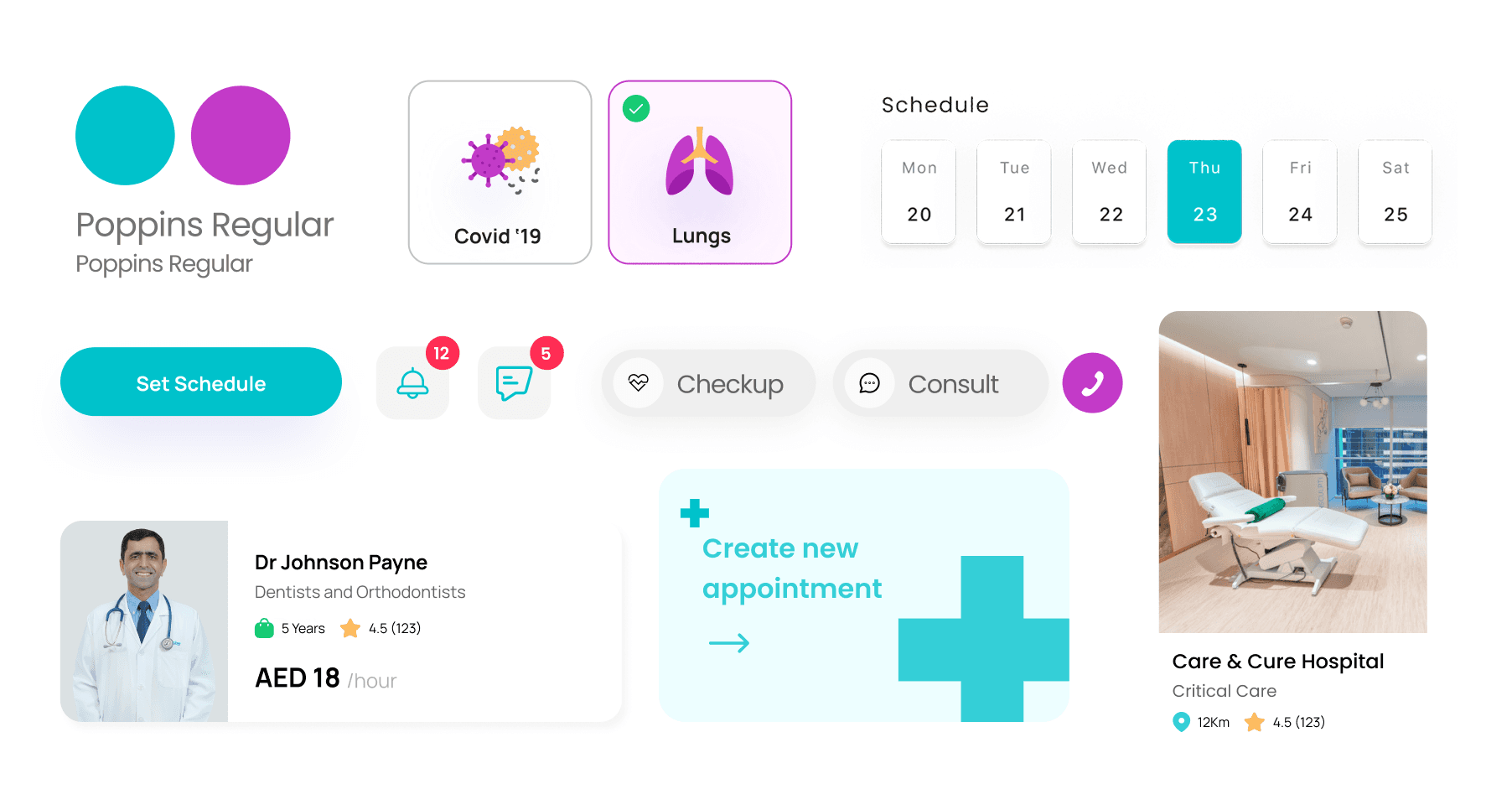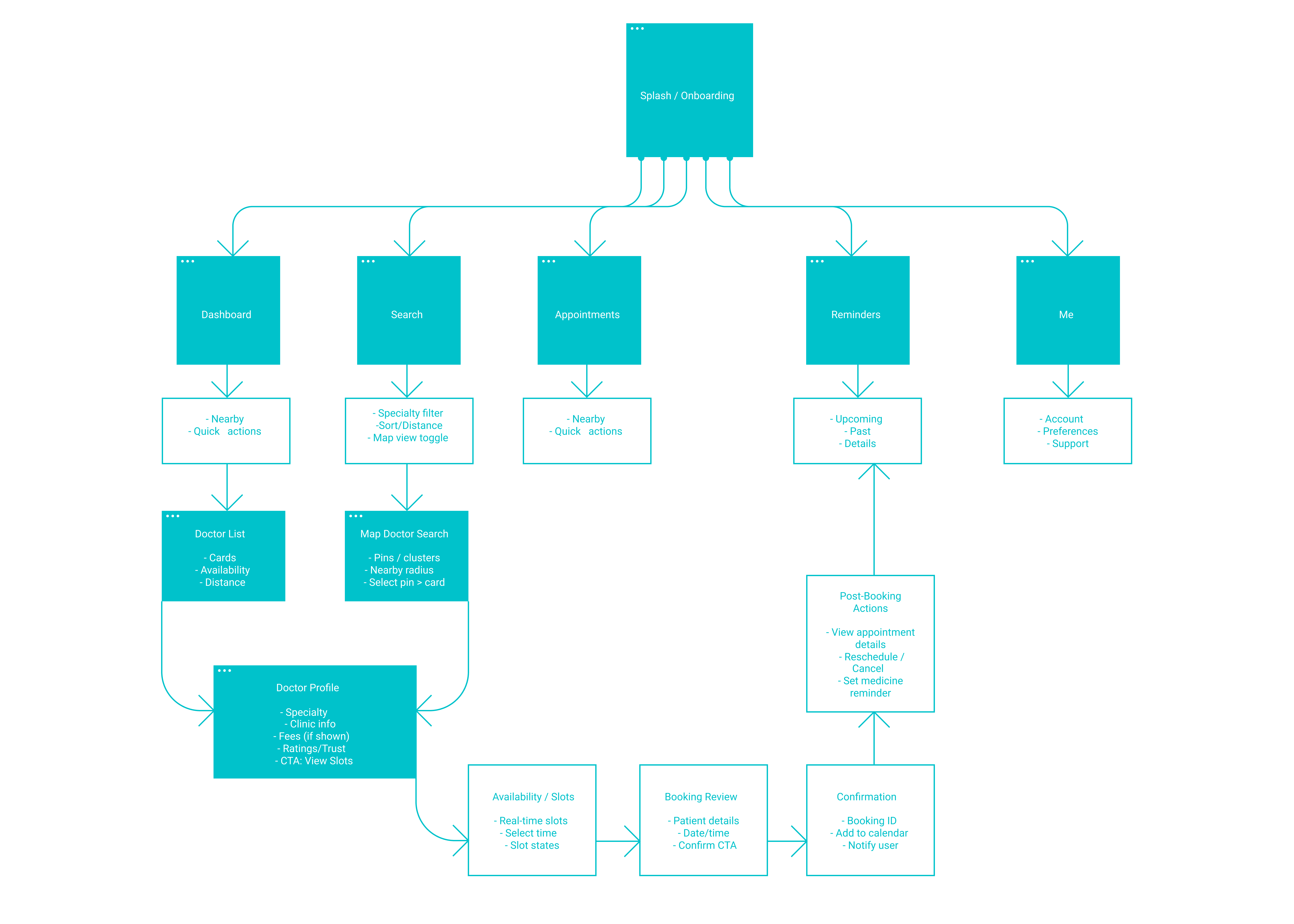 The UI follows a simple, task-first flow that moves users smoothly from doctor discovery to instant booking, minimizing steps and decision fatigue.