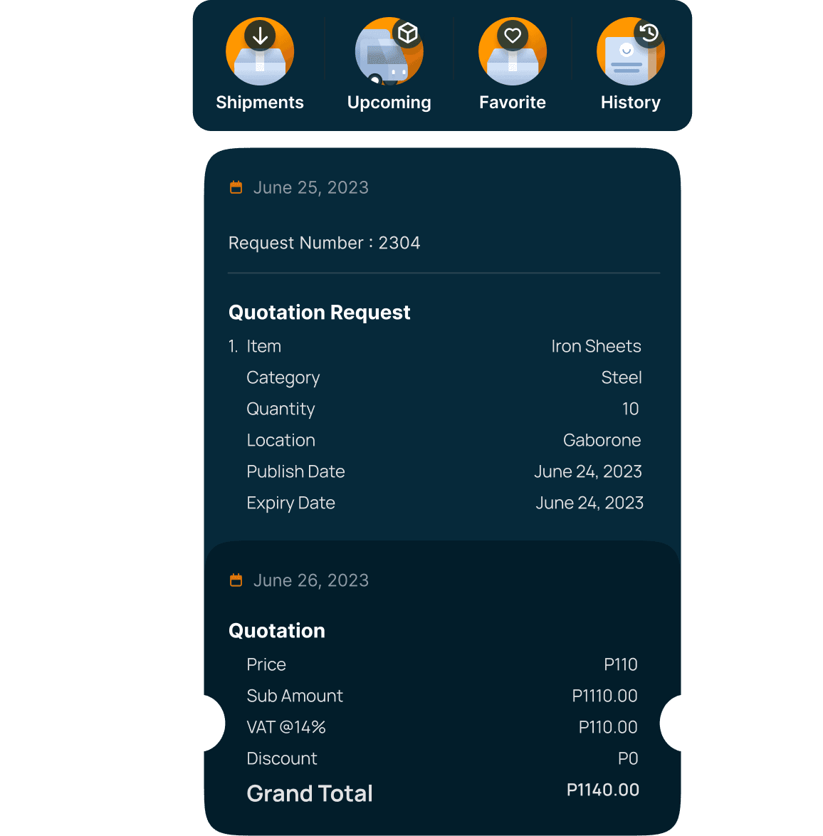 Submitted quotation details alongside seller responses in one place, helping buyers quickly review prices, terms, and updates without chasing suppliers or switching contexts.