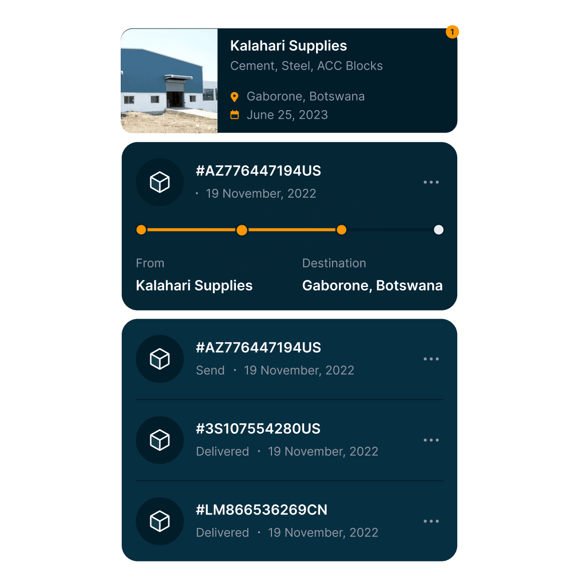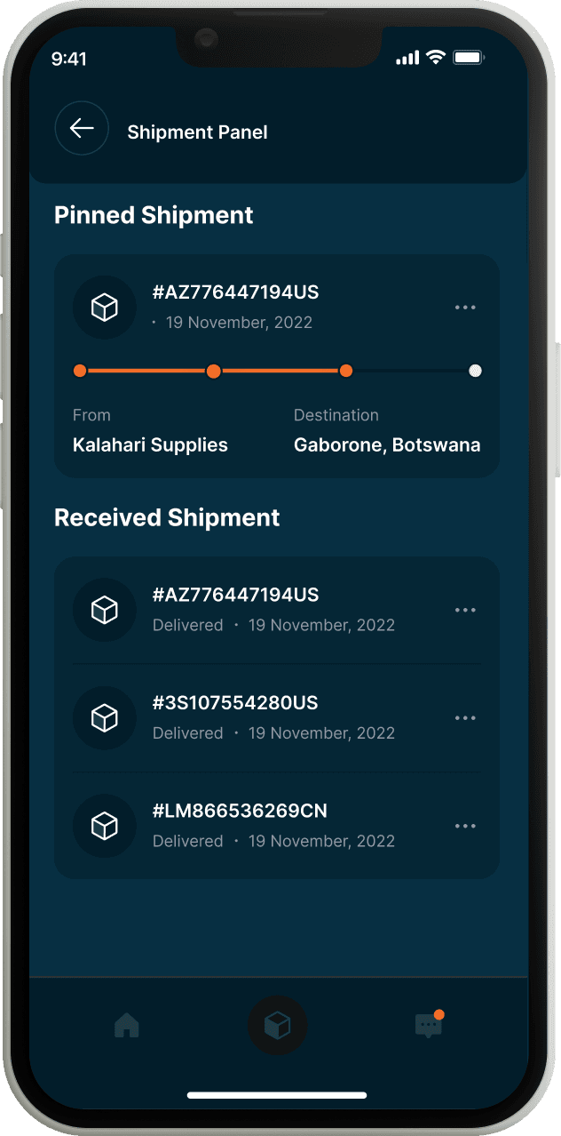 The shipment details screen highlights the currently pinned shipment for quick tracking, while providing clear delivery information and status updates so users can monitor progress and receive shipments with confidence.