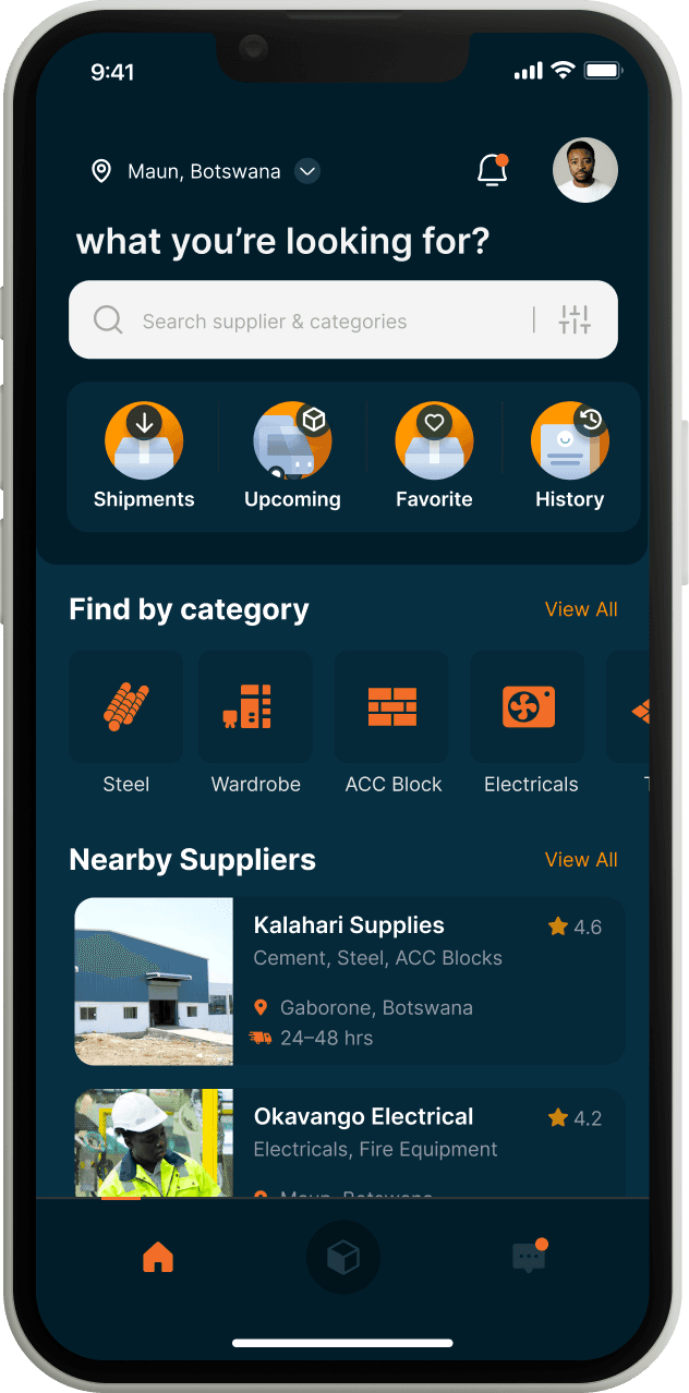 The universal search bar helps users quickly find products, services, or suppliers, quick actions reduce steps for frequent and time-sensitive requests, nearby suppliers surface relevant local options, and bottom navigation enables seamless switching between core workflows.